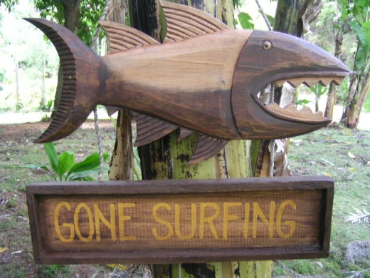 This is a hand made, retro Hawaiian carved wood "GONE FISHING" cool shark fish sign. The sign has been hand carved and hand painted with great attention to detail and has a very artistic touch and rustic feel. This great piece of handicraft measures 15 inches wide by 10 inches tall (38cm x 25cm). It comes ready to hang with 2 hooks in the back.