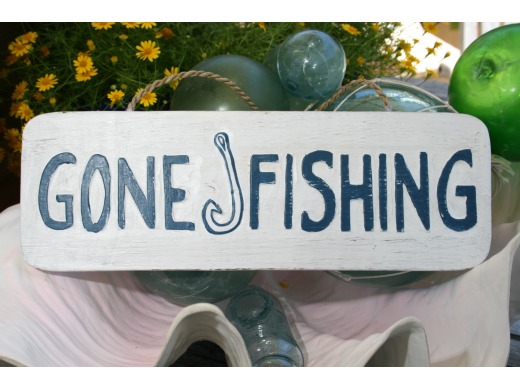 Here is a Hawaiian beach/cottage style "GONE FISHING" welcome sign in rustic white & blue coastal colors.