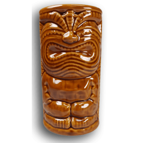 This HAWAIIAN HAPPY TIKI tiki mug has a really nice look and feel to it! Distinctive handle makes it easy to hold. It has been hand crafted and painted and has a handsome golden/brown glaze and ceramic detail. Measurement: 6" high.