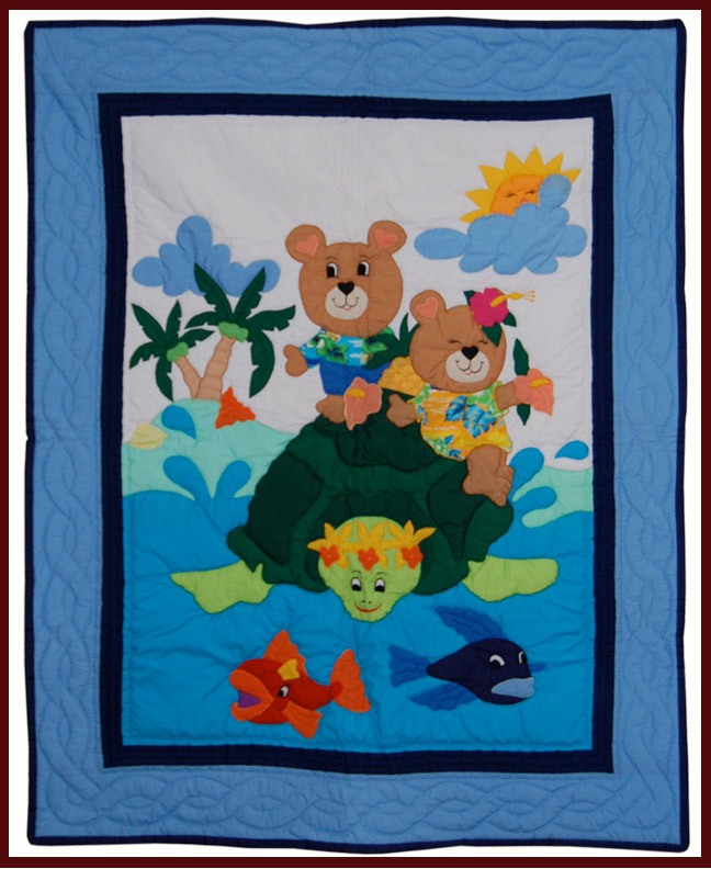 Hawaiian keikis(children) are special and a very important part of our culture in Hawaii. They are given the utmost care and attention in the true aloha spirit. This "HONO SPLASH" baby quilt was hand stitched and appliqued and features extraordinary traditional hawaiian themes.