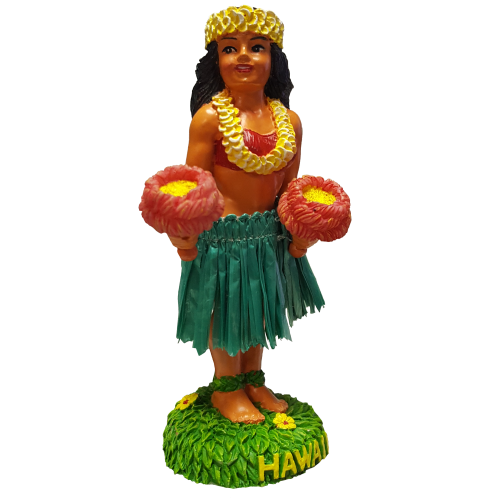 Our newest hula dashboard doll is sculpted by an artist and hand painted with detail. Place her on your car dashboard or desk and watch her hula!