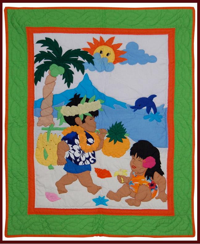 Hawaiian keikis (children) are special and a very important part of our culture in Hawaii. They are given the utmost care and attention in the true aloha spirit. This "KEIKIS PICNIC" baby quilt was hand stitched and appliqued and features extraordinary traditional Hawaiian themes.