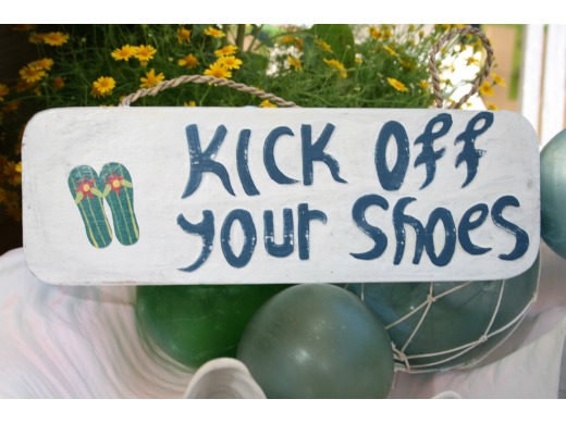 Here is a Hawaiian beach/cottage style "KICK OFF YOUR SHOES" welcome sign in rustic white & blue coastal colors.