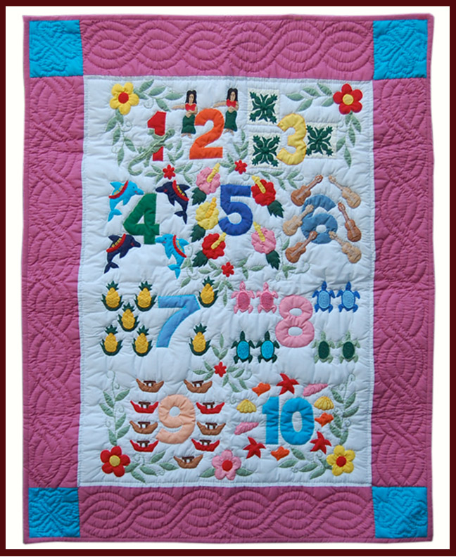 Hawaiian keikis(children) are special and a very important part of our culture in Hawaii. They are given the utmost care and attention in the true aloha spirit. This HAWAIIAN NUMBERS 1 - 10 baby quilt was hand stitched and appliqued and features extraordinary traditional Hawaiian quilting flower patterns between the lettering.