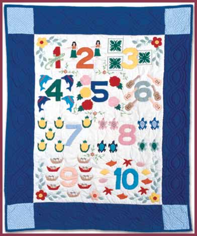 Hawaiian keikis(children) are special and a very important part of our culture in Hawaii. They are given the utmost care and attention in the true aloha spirit. This "1 - 10" baby quilt was hand stitched and appliqued and features extraordinary traditional hawaiian themes between the bold numbers.
