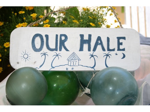 Here is a Hawaiian beach/cottage style "OUR HALE" welcome sign in rustic white & blue coastal colors.