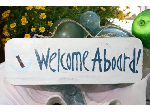 Here is a Hawaiian beach/cottage style "WELCOME ABOARD" welcome sign in rustic white & blue coastal colors.