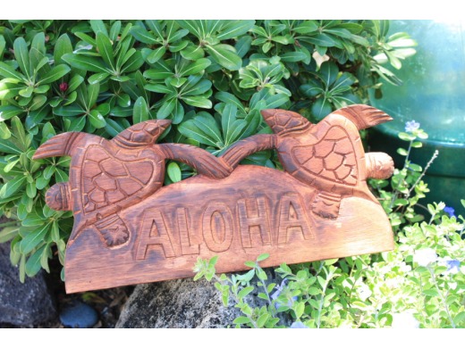 This is a hand made, retro Hawaiian carved wood "ALOHA" tiki bar sign. It is flanked by two sculptured green turtles. The sign has been hand carved with great attention to detail and has a very artistic touch and rustic feel. This great piece of handycraft measures 12 inches wide by 7.5 inches tall. It comes ready to hang with 2 hooks in the back.