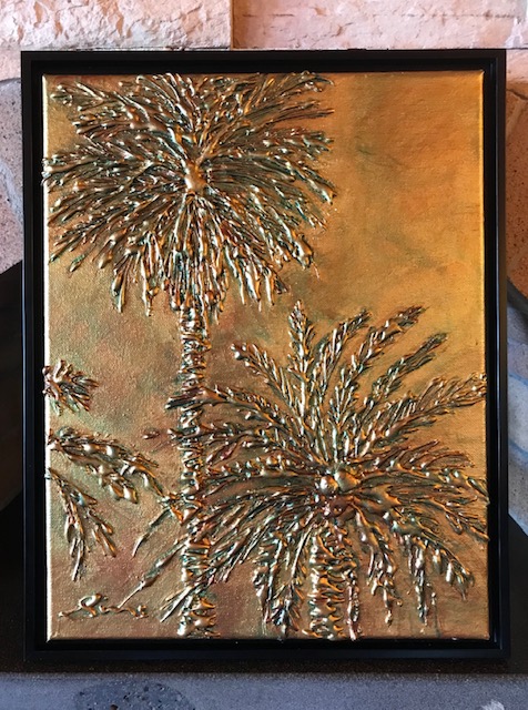 This richly textured painting captures a golden Hawaiian Sunset with palm trees in the foreground. It's reminiscent of an old Banyan tree and the knotted, gnarled branches and roots symbolize to me the twists and turns that life takes sometimes. "Hawaiian Golden Sunset Palms" is a place to slow down and reflect on the day, preferably with a tropical cocktail in hand... Rest for a moment in the cool shade of the tree and feel the warm evening tropical breeze... and take a sip of the island life it has to offer with you...