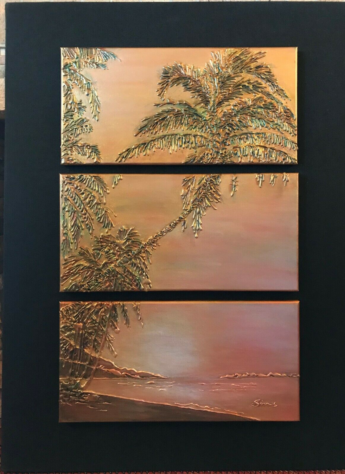 This richly textured painting captures a golden Hawaiian Sunset with palm trees in the foreground. "Hawaiian Golden Sunset Palms" is a place to slow down and reflect on the day, preferably with a tropical cocktail in hand... Rest for a moment in the cool shade and feel the warm evening tropical breeze... and take a sip of the island life while you relax...