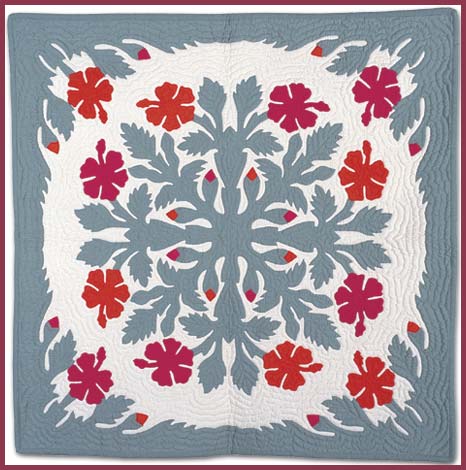 Each wall hanging is hand quilted by Master Quilters taught in the traditional Hawaiian style of quilting. Each Quilt has over 250,000 stitches and average 6-8 stitches per inch. We appliqué the design using the hidden or "blind" stitch onto the background material. It is then quilted with a ripple or echo pattern. Every piece is hand made with great care to insure your total satisfaction. Please contact us for availability and special orders (at NO EXTRA COST!).