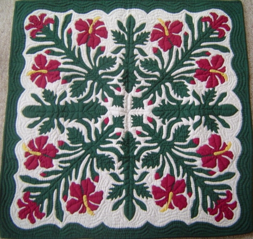Each wall hanging is hand quilted by Master Quilters taught in the traditional Hawaiian style of quilting. Each Quilt has over 250,000 stitches and average 6-8 stitches per inch. We appliqué the design using the hidden or "blind" stitch onto the background material. It is then quilted with a ripple or echo pattern. Every piece is hand made with great care to insure your total satisfaction. Please contact us for availability and special orders (at NO EXTRA COST!).
