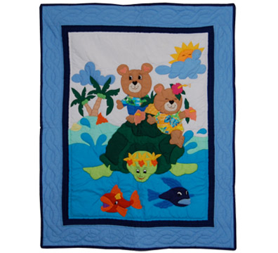 Hawaiian keikis(children) are special and a very important part of our culture in Hawaii. They are given the utmost care and attention in the true aloha spirit. This "HONO SPLASH" baby quilt was hand stitched and appliqued and features extraordinary traditional Hawaiian themes.