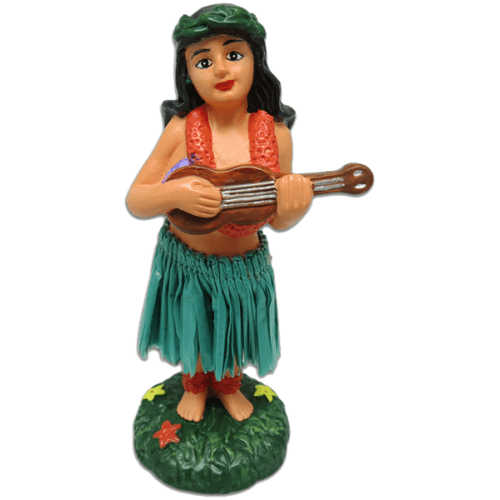 Lovely hula girl with ukulele dashboard doll is sculpted by an artist and hand painted with detail. Place her on your car dashboard or desk and watch her hula.