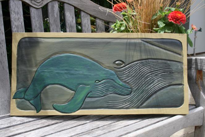 Here is a beautiful wooden storyboard, hand carved and hand painted featuring a Humpback Whale with her calf.