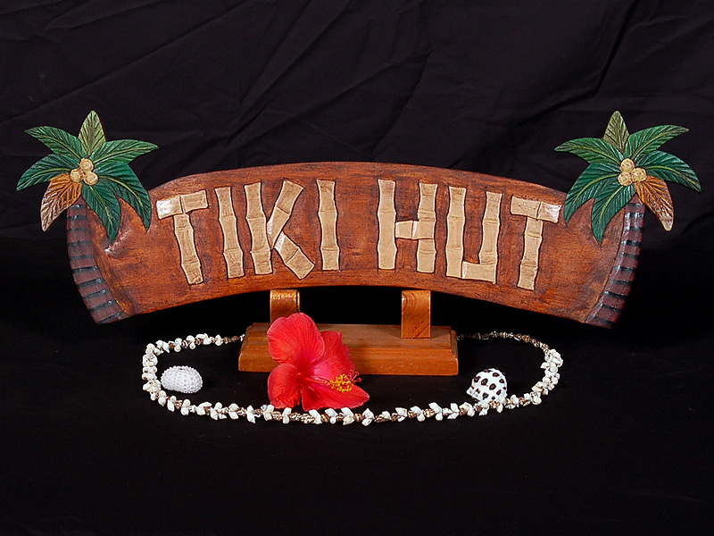 This is a hand made, retro carved wood tiki bar sign with the wording "TIKI HUT", featuring two carved palm trees. The sign has been hand carved and hand painted with great attention to detail and has a very artistic touch and rustic feel.
