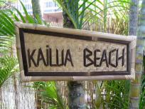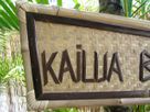 This is a hand made, bamboo Tiki bar sign with the wording "KAILUA BEACH". It is bamboo framed, and backed with a woven mat. It measures 19 1/2 inches X 10 inches.