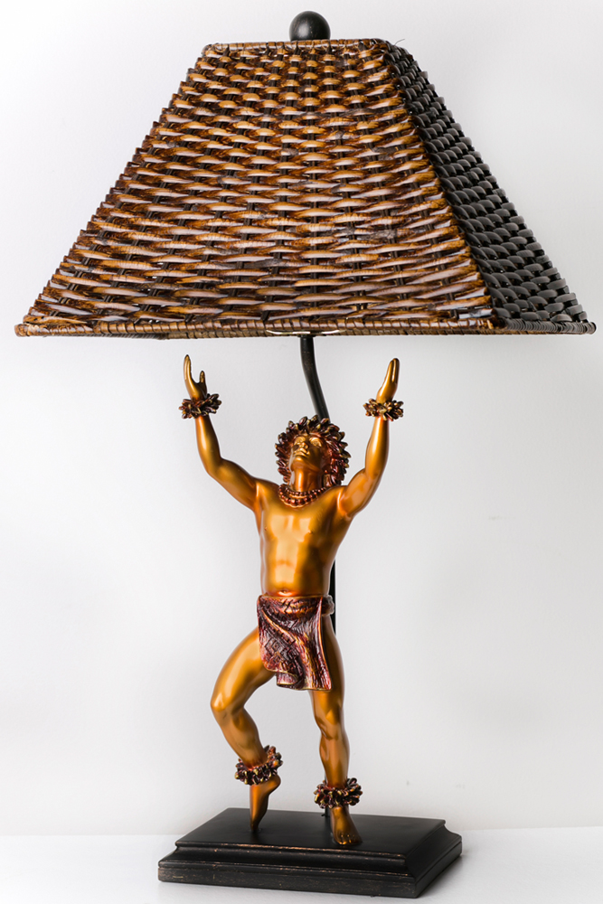This elegant hula lamp by artist Kim Taylor Reese brings the beauty of the Hawaiian islands and the spirit of the hula into your home. In true Hawaiian style, Pahoe wears nothing but a traditional hula skirt and a lei around hes neck.