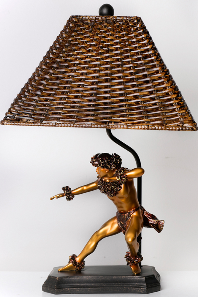 This elegant hula lamp by artist Kim Taylor Reese brings the beauty of the Hawaiian islands and the spirit of the hula into your home. In true Hawaiian style, Kahiko Kane wears nothing but a traditional hula skirt and a lei around his neck.