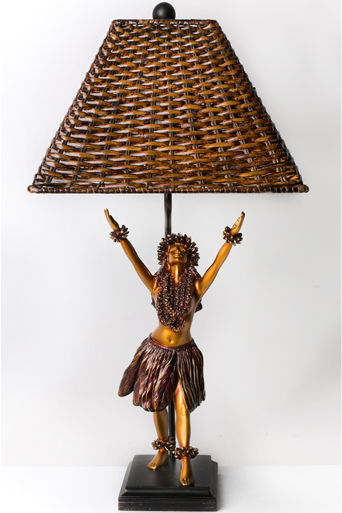 This elegant hula lamp by artist Kim Taylor Reese brings the beauty of the Hawaiian islands and the spirit of the hula into your home. In true Hawaiian style, Pahoe wears nothing but a traditional hula skirt and a lei around hes neck.