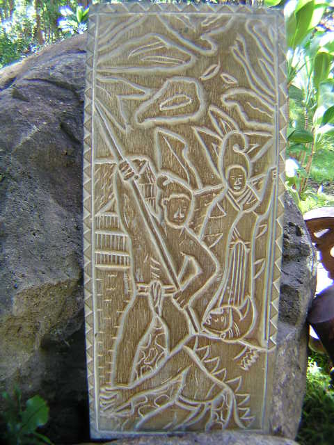Dimensions: The wooden relief measures 30" X 13" X 1" (76cm X 33 cm X 3 cm). It is entitled: KING OF THE SANDWICH ISLANDS