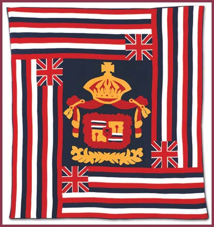 One of our most stunning Hawaiian quilts is Our Beloved Flag of 1887. Nothing says Hawai’i more than the royal crest and flag of Kalakaua. Many Flag-quilts have been made but this design is unparaleled for its sharpness and clean lines. We have also offer matching wall hangings and throw pillows in this design to complete the harmony.