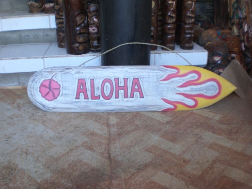 This is a beautiful hand carved vintage looking surf sign with the wording "ALOHA" and decorated with flames. Each letter of Aloha is raised (hand carved).