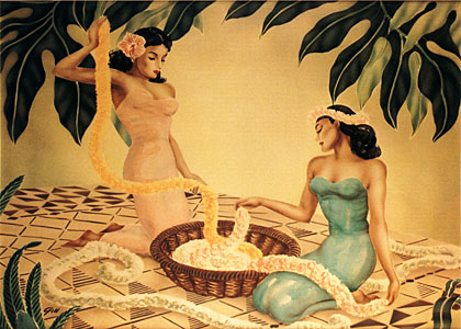 This incredibly popular airbrush image, entitled LEI MAKERS, has become synonymous with nostalgia hawaiiana. GILL conveyed a sense of elegance and femininity in his work that is unsurpassed to this day. His talent and sensitivity is expressed in fully capturing the grace and beauty of the island wahine. His other vintage artwork depicts stylish art-deco images of hawaiian scenes, with titels such as Leimakers, Hawaiian Drummer, Hawaiian Fisherman, Hula Dancer etc.