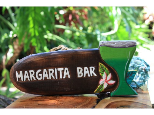 This is a hand made wooden tiki bar sign with the wording: "MARGARITA BAR" and featuring a refreshing Margarita. A great sign to give your tiki bar a very tropical look. Also, perfect for your home or your outdoor living area!