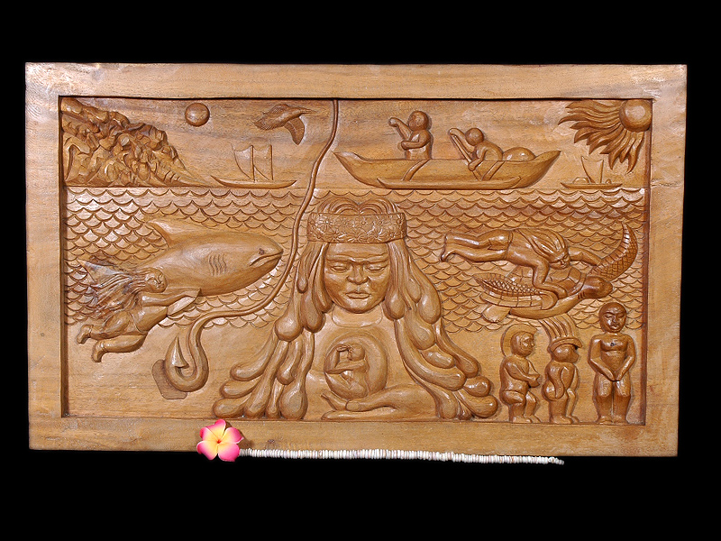 Here is a beautiful wooden storyboard, hand carved of premium Koa Wood, featuring "MAUI & PELE"