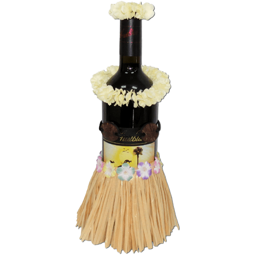 Have fun with this exotic wine bottle outfit with red grass skirt. About as Hawaiian as you can get! Guaranteed to delight your guests and definitely a great conversation piece.