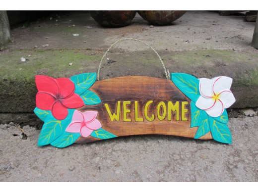 This is a hand made vintage looking "WELCOME" Tiki bar sign, on a hand carved and hand painted board featuring tropical plumeria flowers.