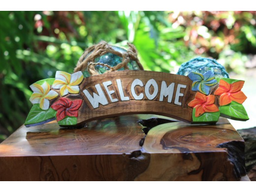 This is a hand made vintage looking "WELCOME" Tiki bar sign, on a hand carved and hand painted board featuring tropical plumeria flowers.