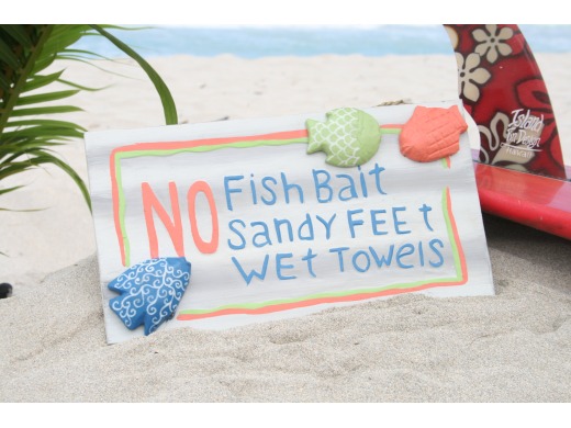 Here is a Hawaiian beach/cottage style "NO FISH BAIT, SANDY FEET, WET TOWELS" beach welcome sign in weathered rustic coastal colors.