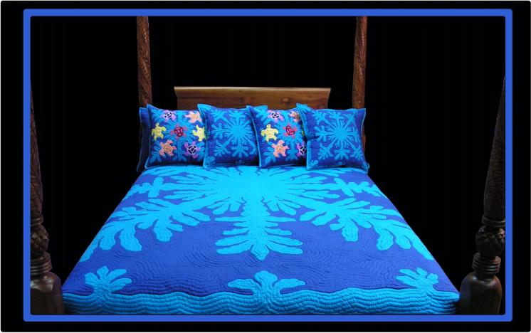 This OCEAN CORAL design, is a contemporary quilt showcasing some of the most recognizable symbols of Hawai’i, the ocean and it's beauty. Probably our most requested colors for this quilt are the aqua blue and turqoise. Have fun with this exotic quilt!