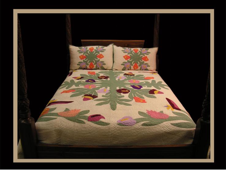 Each "Kapa" (Quilt in Hawaiian...) is hand quilted by Master Quilters taught in the traditional Hawaiian style of quilting. Each Quilt has over 250,000 stitches and average 6-8 stitches per inch. We appliqué the design using the hidden or "blind" stitch onto the background material. It is then quilted with a ripple or echo pattern. Every piece is hand made with great care to insure your total satisfaction and comes with matching pillow shams. Please contact us for availability and special orders (NO EXTRA COST!).
