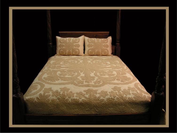 Timeless and Elegant... perhaps one of the most beautiful and intricate quilts ever hand made. The grandeur of this quilt is almost as fragrant as the two popular flowers after which it is named. The border is very detailed, with almost a embroidered, lace look to it. Both the Pikake and Tuberose are some of Hawaii’s favorite flowers.