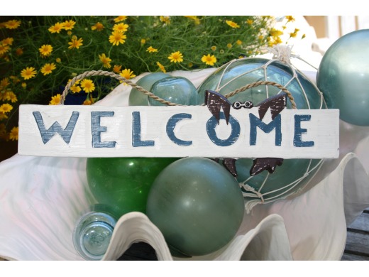 Here is a Hawaiian beach/cottage style "WELCOME" welcome sign in rustic white & blue coastal colors.