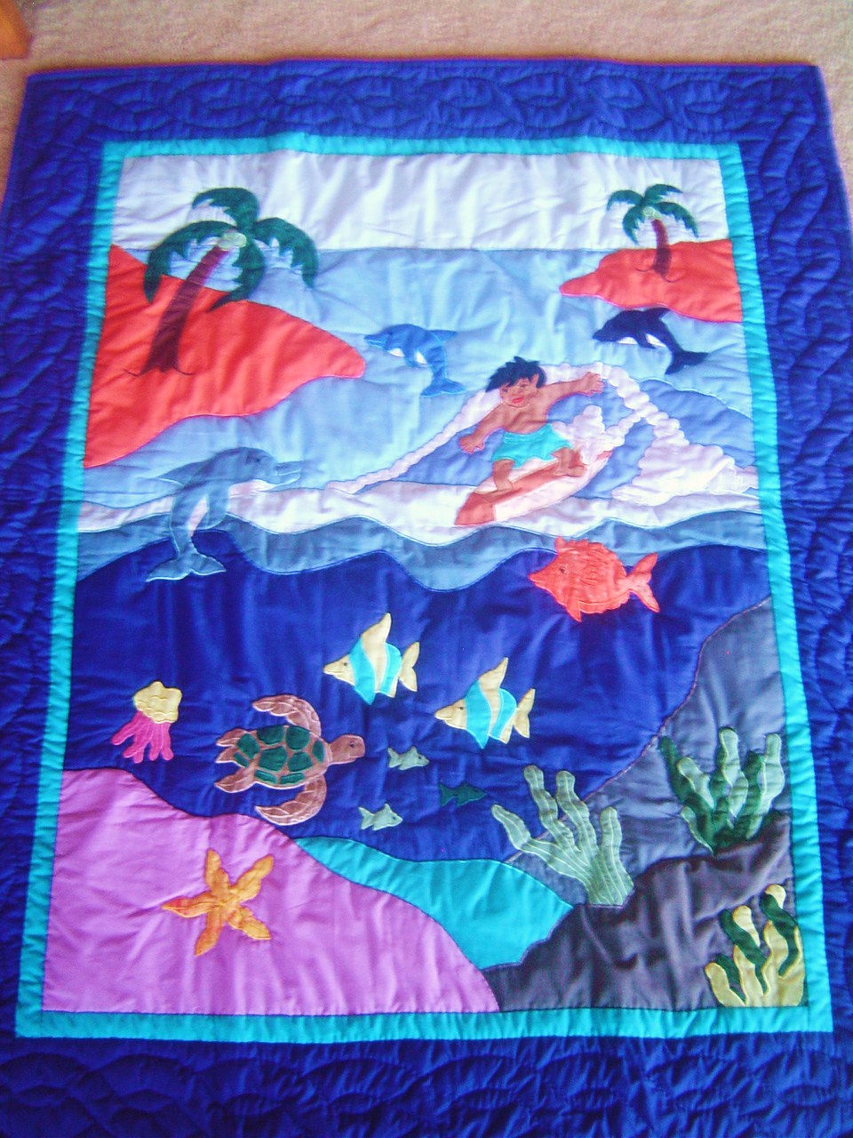 Hawaiian keikis(children) are special and a very important part of our culture in Hawaii. They are given the utmost care and attention in the true aloha spirit. This "UNDER SEA" baby quilt was hand stitched and appliqued and features extraordinary traditional Hawaiian themes.