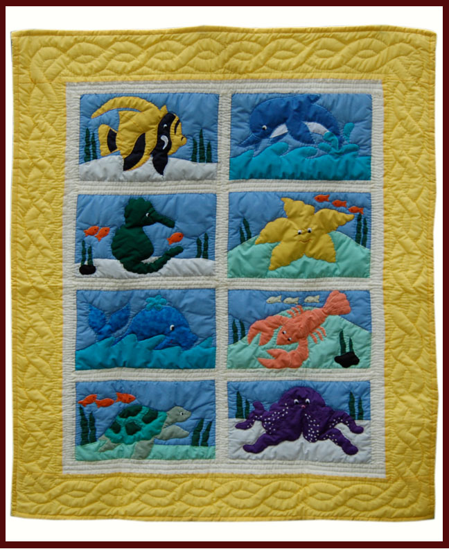 Hawaiian keikis(children) are special and a very important part of our culture in Hawaii. They are given the utmost care and attention in the true aloha spirit. This "SEA LIFE Squares" baby quilt was hand stitched and appliqued and features extraordinary traditional Hawaiian themes.