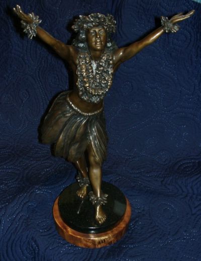 This elegant, Ku'ulei Bronze Hula Girl Statue brings the true aloha spirit into your home. Reaching to the heavens Ku'ulei is adorned in sweet smelling plumeria leis around her neck, and leaf leis around her wrists and ankles. Her skirt is the ti leaf worn by those dancers who dance the ancient Kahiko style of Hawaiian dance.