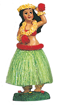 This beautiful dashboard doll is sculpted by an artist and hand painted to detail. She wears a classic green hula skirt and a Hawaiian flower lei around her neck. Place her on your car dashboard and watch her sway her grass skirt. She will be your perfect driving companion...