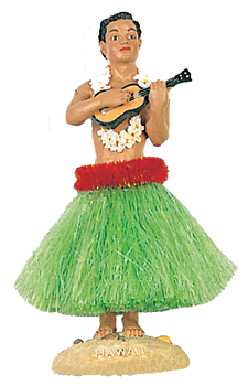 This beautiful dashboard doll is sculpted by an artist and hand painted to detail. He wears a classic green hula skirt and a Hawaiian flower lei around his neck. Place him on your car dashboard and watch him sway his grass skirt. He will be your perfect driving companion...