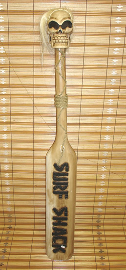 Here is an artfully designed Tiki paddle that was hand carved and hand painted with geat attention to details. It has the wording SURF SHACK on the blade. It has an an antique finish which gives it a beautiful vintage look. Measurement: 46" X 6" (120 cm by 15 cm).