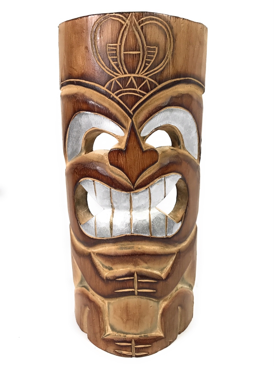 This is the Fury Road Tiki Mask. There must Be Only One! This beautiful mask was carefully hand crafted and painted by an experienced carver. It has a beautiful burnt, antique finish. Also note the intricate carved detail of the wood and attention to color on the mask.