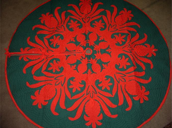 Hawaiian Hand Quilted Christmas Tree Skirt. Classic Pine design in Green and Red. Gifts with Aloha...