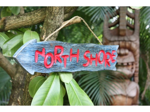 This is a hand made vintage looking sign with the wording "North Shore" on it. It has been hand carved and hand painted on driftwood.