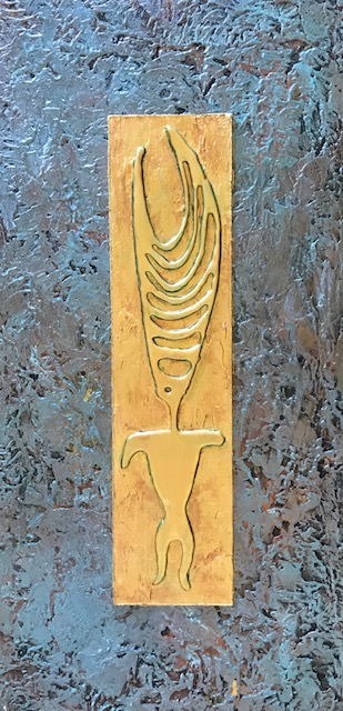 Original Petroglyph relief paintings, by Hawaii artist Ilze Sims, are richly textured in earthy tones of copper, browns, antique bronze and gold, with a verdigris blue green patina resembling moss covered lava rock. The raised relief of the petroglyphs combined with the textured background create a beautiful 3D effect. It will add a distinctive Hawaiian theme and contemporary, tropical feel to your home and a touch of royalty to your walls!