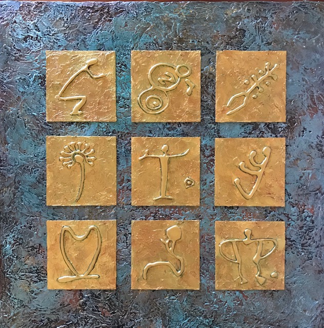 This painting has a richly textured background in earthy tones of copper, browns, antique bronze and gold, with a verdigris blue green patina resembling moss covered lava rock. The raised relief of the petroglyphs combined with the texture create a beautiful 3D effect.