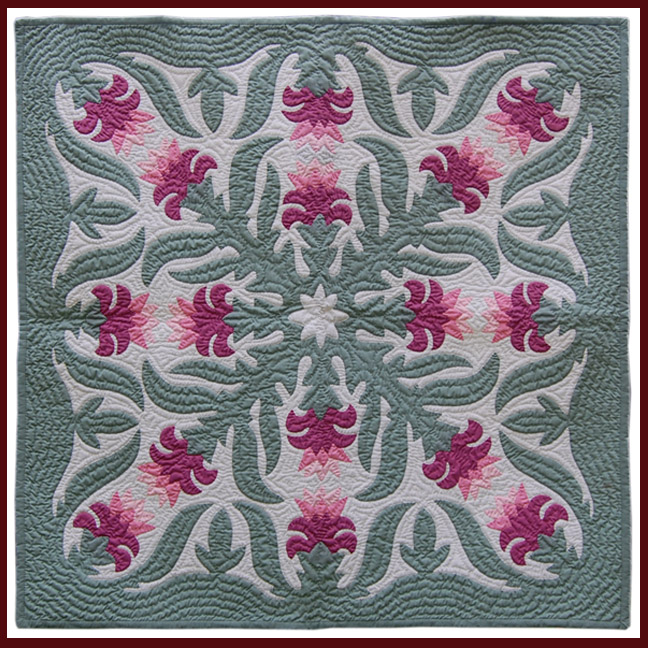 Each wall hanging is hand quilted by Master Quilters taught in the traditional Hawaiian style of quilting. Each Quilt has over 250,000 stitches and average 6-8 stitches per inch. We appliqué the design using the hidden or "blind" stitch onto the background material. It is then quilted with a ripple or echo pattern. Every piece is hand made with great care to insure your total satisfaction. Please contact us for availability and special orders (at NO EXTRA COST!).